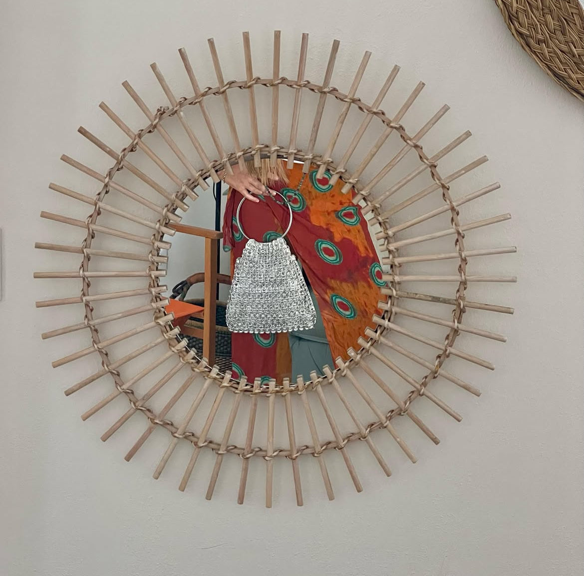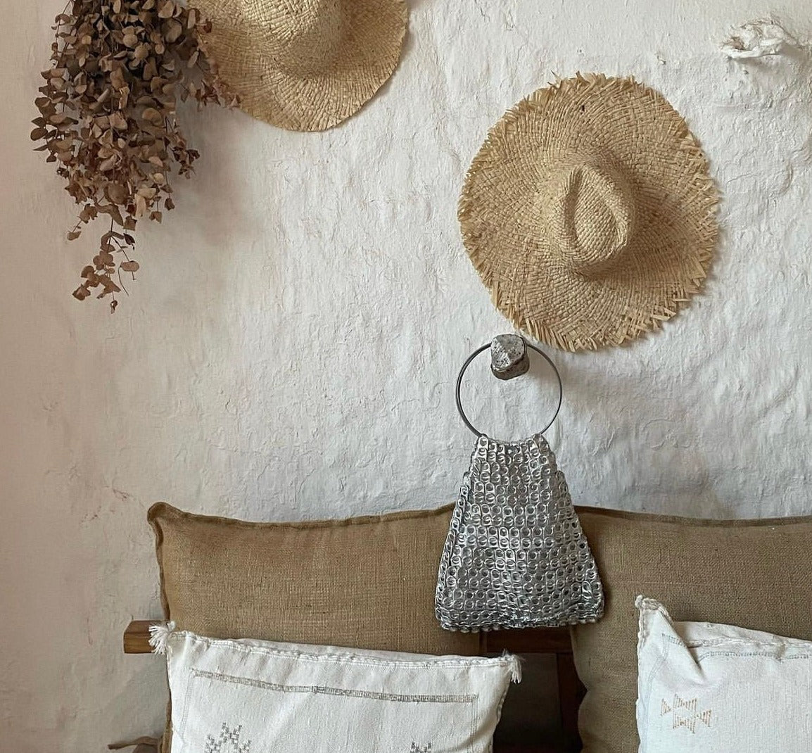 Triangular-shaped bag with two circular handles. Inner lining and magnetic closure.