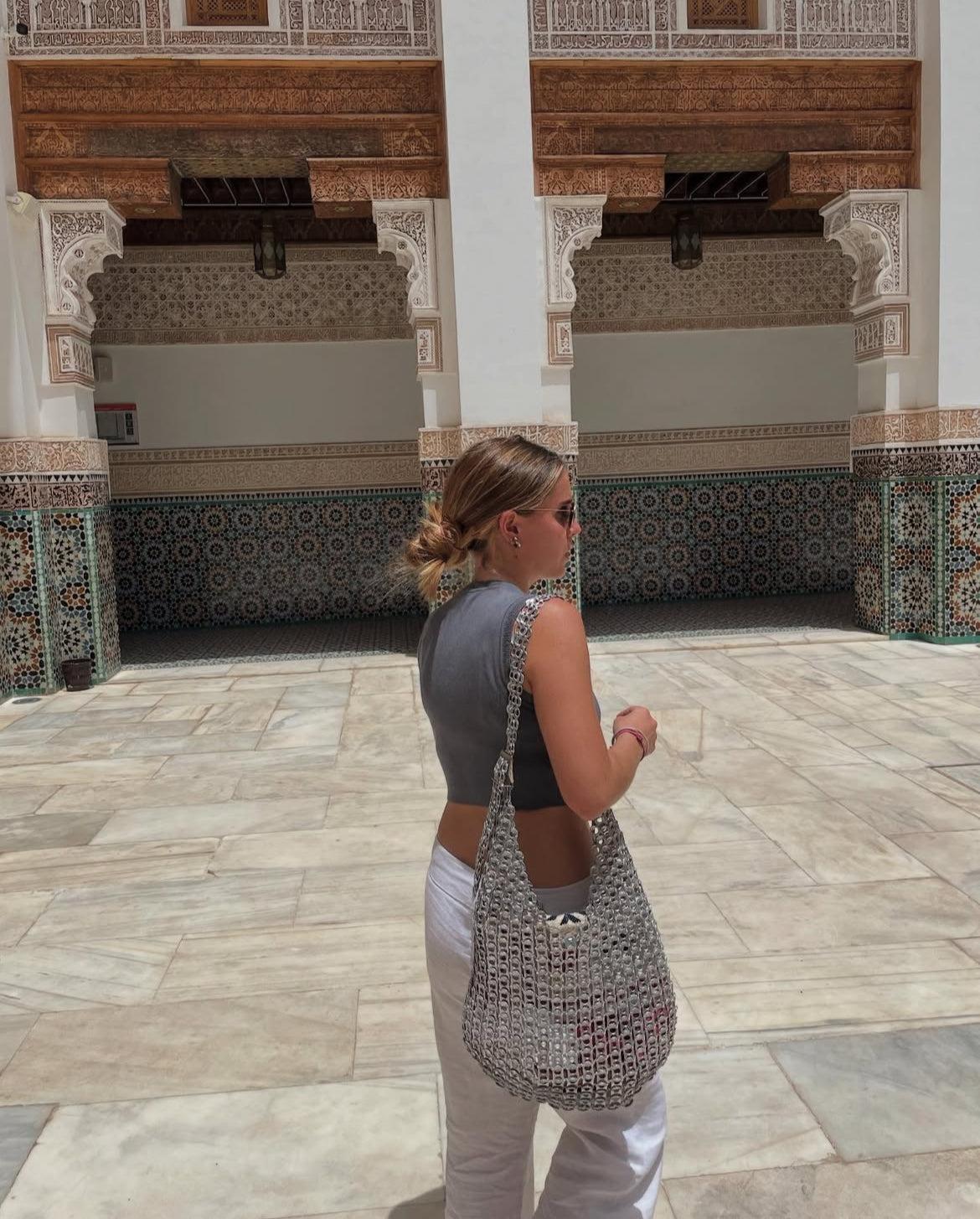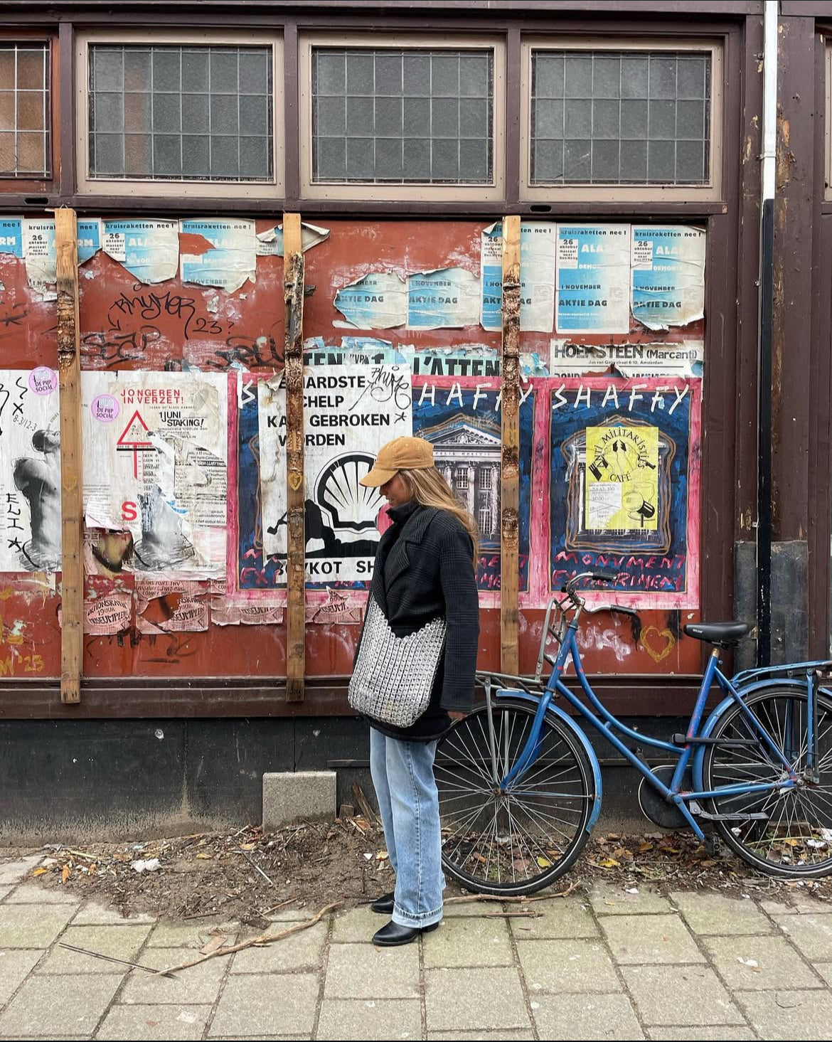 Rounded shape and adjustable strap for crossbody or shoulder wear. Unlined interior and secure magnetic closure