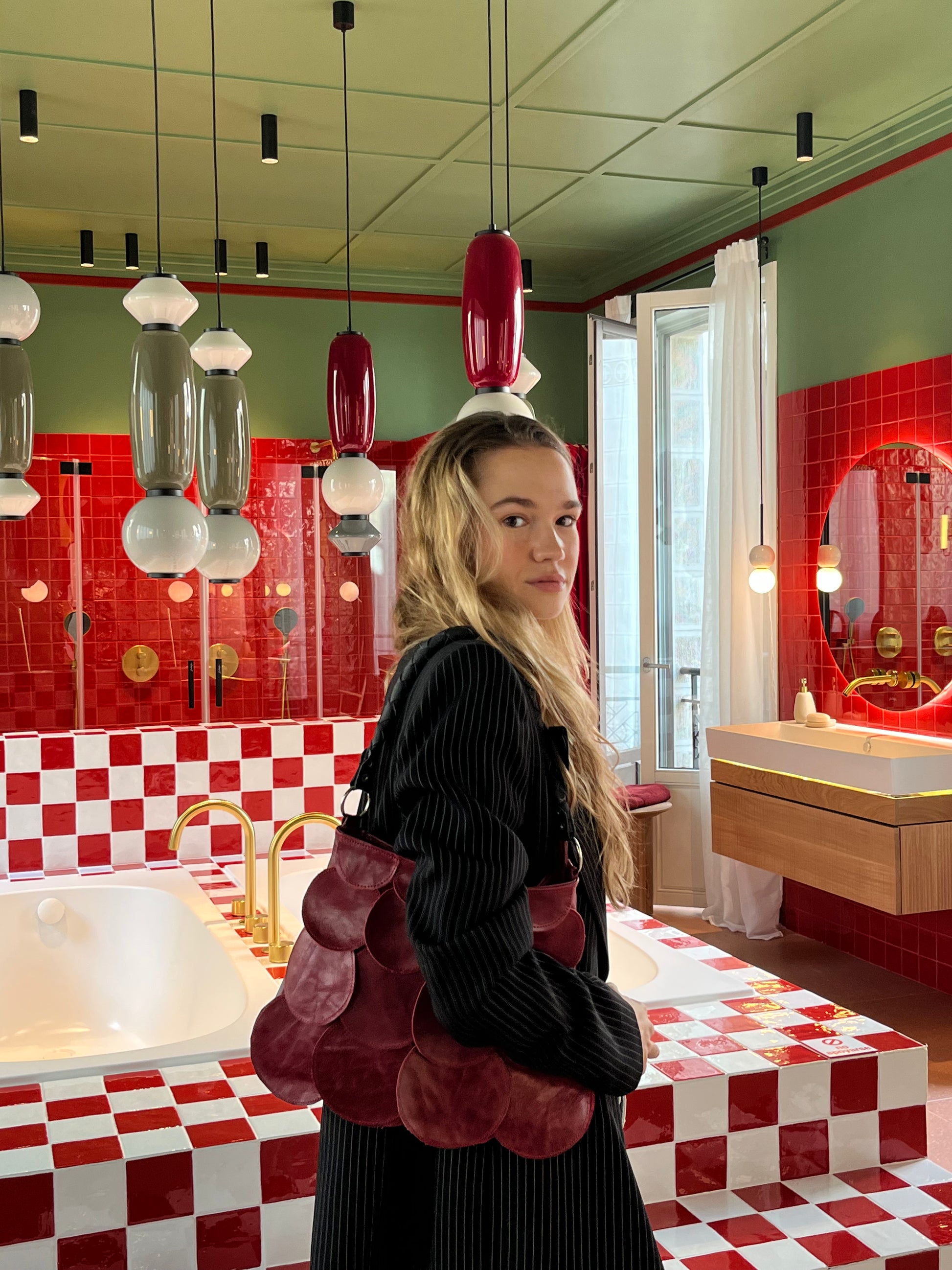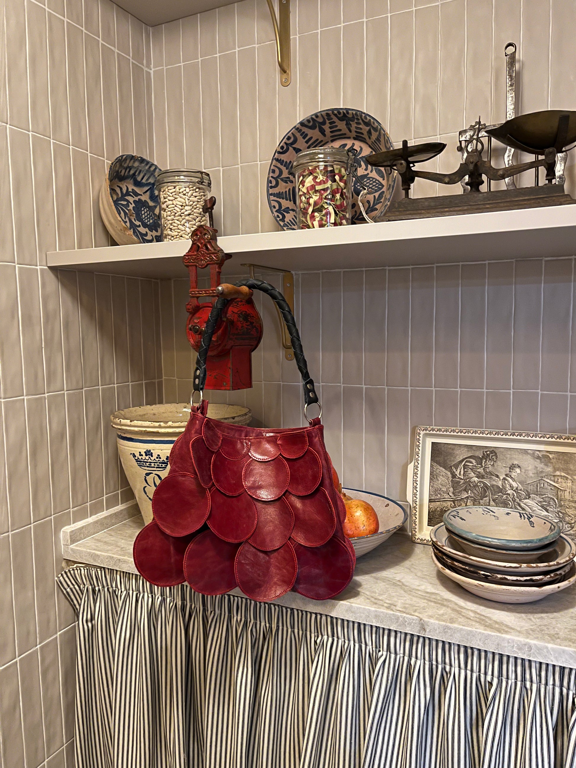 100% leather bag in raspberry tone. Black braided strap in leather and zip closure. Fully lined interior with inner pockets.